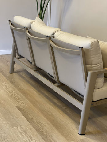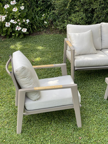 Living con estructura de aluminio pintada al horno en color champagne. Confeccionado con almohadones de 10cm de espesor (en asiento y respaldo) realizados con tela náutica. Mesa ratona de aluminio color champagne combinado con tapa de aluminio símil madera
