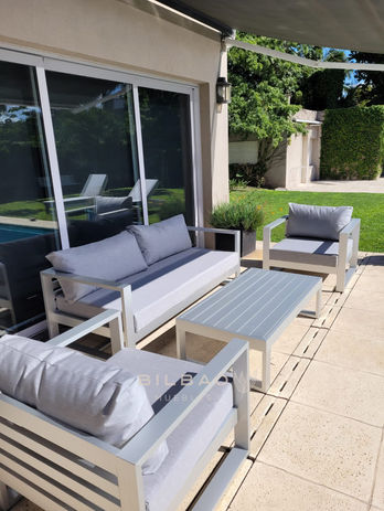 La línea Valencia está fabricada con perfiles de aluminio de 75 x 25 mm y 50 x 25 mm. El respaldo se encuentra a la misma altura que los apoyabrazos y el ancho de estos últimos es de 75 mm. La abertura en los laterales es totalmente limpia mientras que el respaldo se lleva todo el protagonismo con numerosos perfiles de aluminio. La base se encuentra cerrada en los laterales, mientras que el frente y la parte trasera se encuentran despejados.
