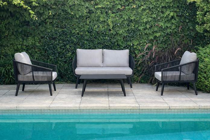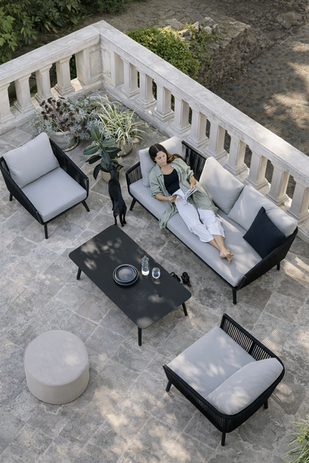 Living con estructura de aluminio pintada al horno en color negro. Confeccionado con sogas y almohadones de 10cm de espesor (en asiento y respaldo) realizados con tela náutica