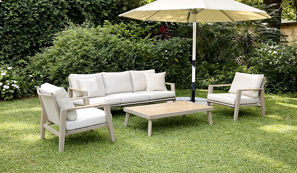 Living con estructura de aluminio pintada al horno en color champagne. Confeccionado con almohadones de 10cm de espesor (en asiento y respaldo) realizados con tela náutica. Mesa ratona de aluminio color champagne combinado con tapa de aluminio símil madera